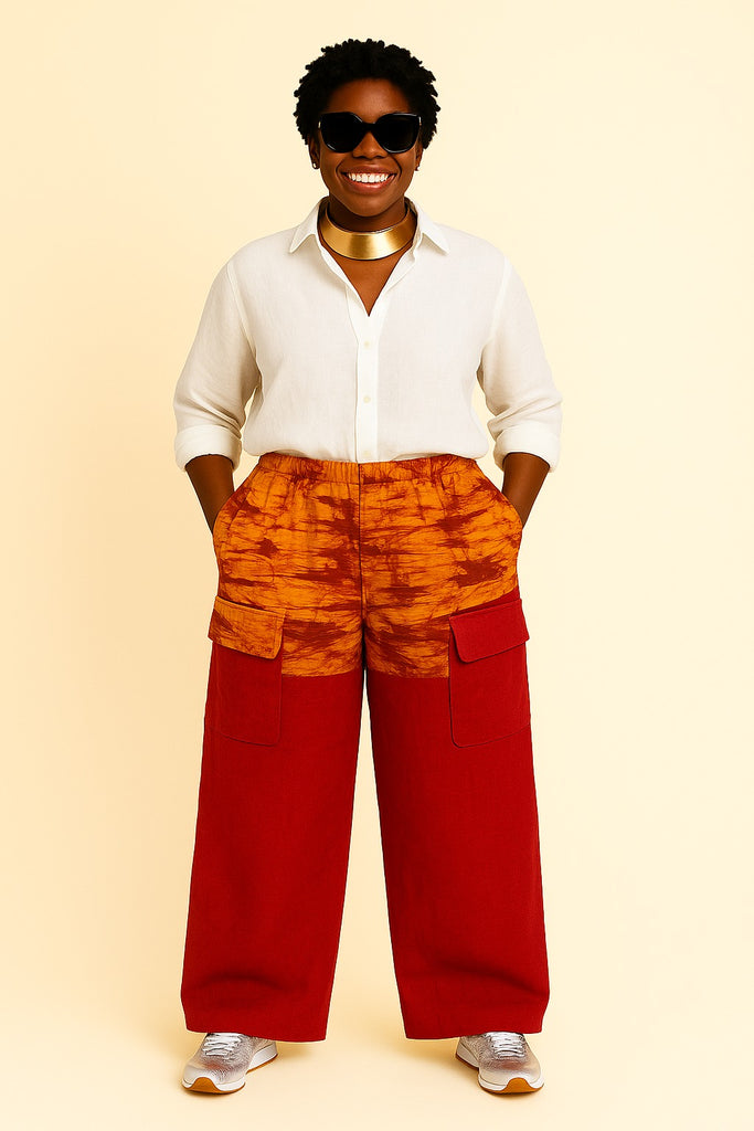 This Vibrant Tie-Dye & Aso-Oke Combat Baggy Pant is a bold and stylish piece designed for comfort and statement fashion. The upper section features a rich orange and maroon tie-dye pattern, blending traditional artistry with modern street style. The lower section is made of solid red Aso-Oke fabric, creating a striking contrast and cultural depth. The pant has a free wide-leg baggy fit that flows effortlessly, with an oversized combat pocket positioned low on the side for an edgy, functional detail. Designed for height and elegance, this pant elongates the frame and pairs perfectly with sneakers or sandals, making it ideal for casual chic or urban-inspired looks.