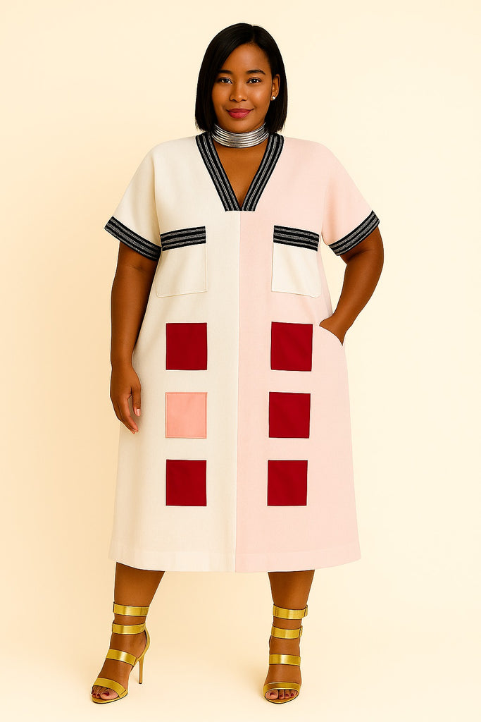 This contemporary Net Aso-Oke dress is designed with a 24-inch wide body for a relaxed, elegant fit. It features six bold square patches arranged in two perfectly horizontal rows of three each, creating a striking visual balance. The dress is styled with a V-neckline bordered with Aso-Oke trimming and short sleeves finished with matching Aso-Oke edge borders. Two front pockets are positioned slightly above the waistline for both style and practicality. Completed with gold high-heeled strappy sandals, neatly red-polished toenails, and a bold silver choker necklace, this look is perfected by neck-length straight permed hair and a confident hand-in-pocket pose—an ideal blend of cultural heritage and modern fashion.