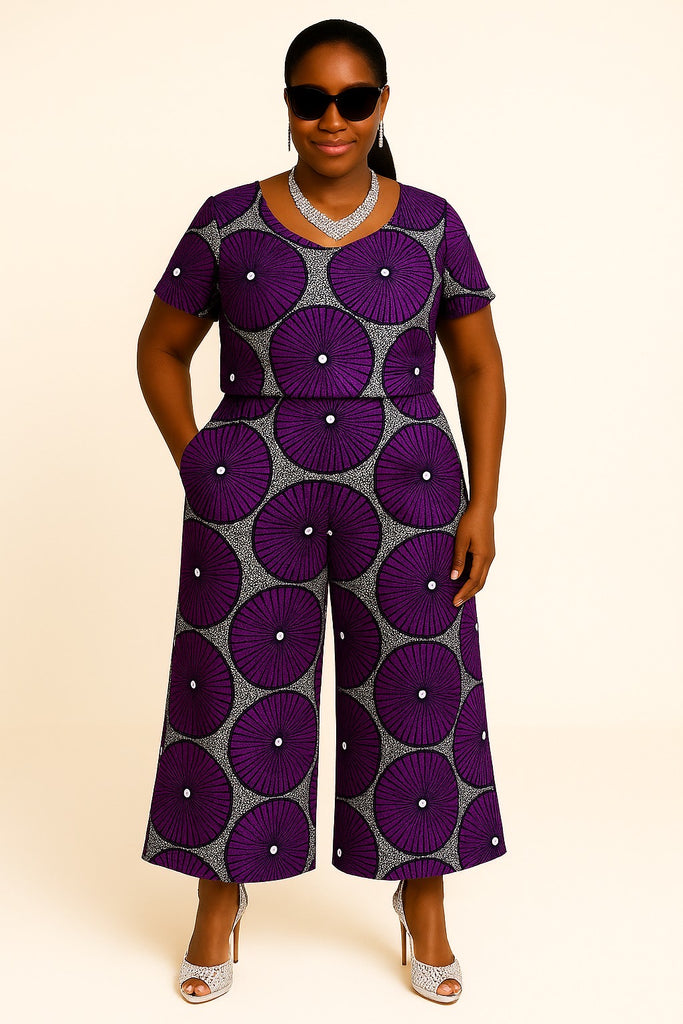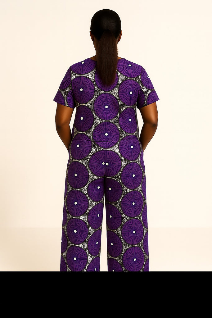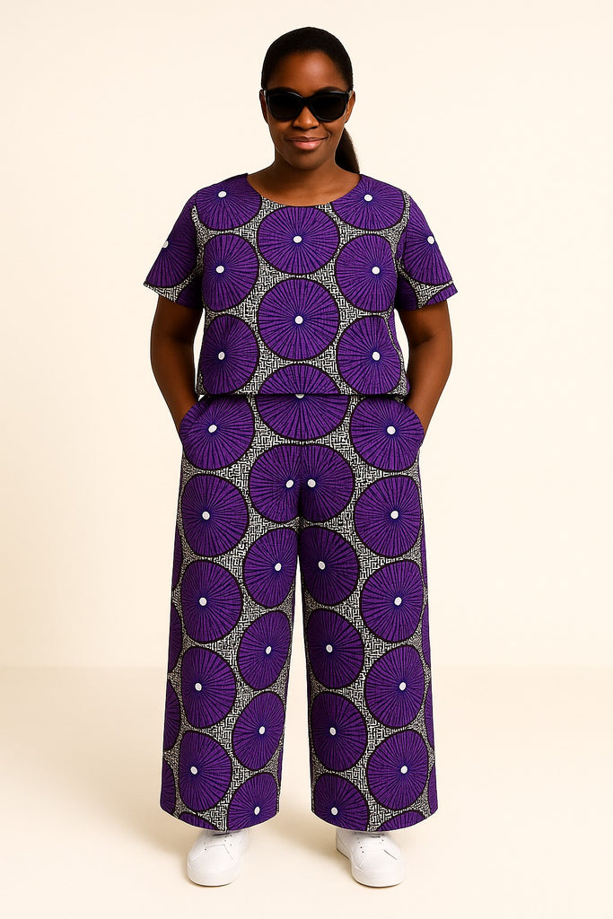 This striking two-piece set celebrates African fashion with a modern twist. Made from vibrant Ankara fabric, the ensemble features a round-neck crop top and matching full-length baggy pants designed for effortless style and comfort. The bold circular patterns in rich purple and black make a confident statement, while the relaxed fit flatters a range of female body shapes. A perfect example of contemporary African women's clothing, this top-and-pant outfit blends tradition with casual elegance—ideal for everyday wear or cultural events.